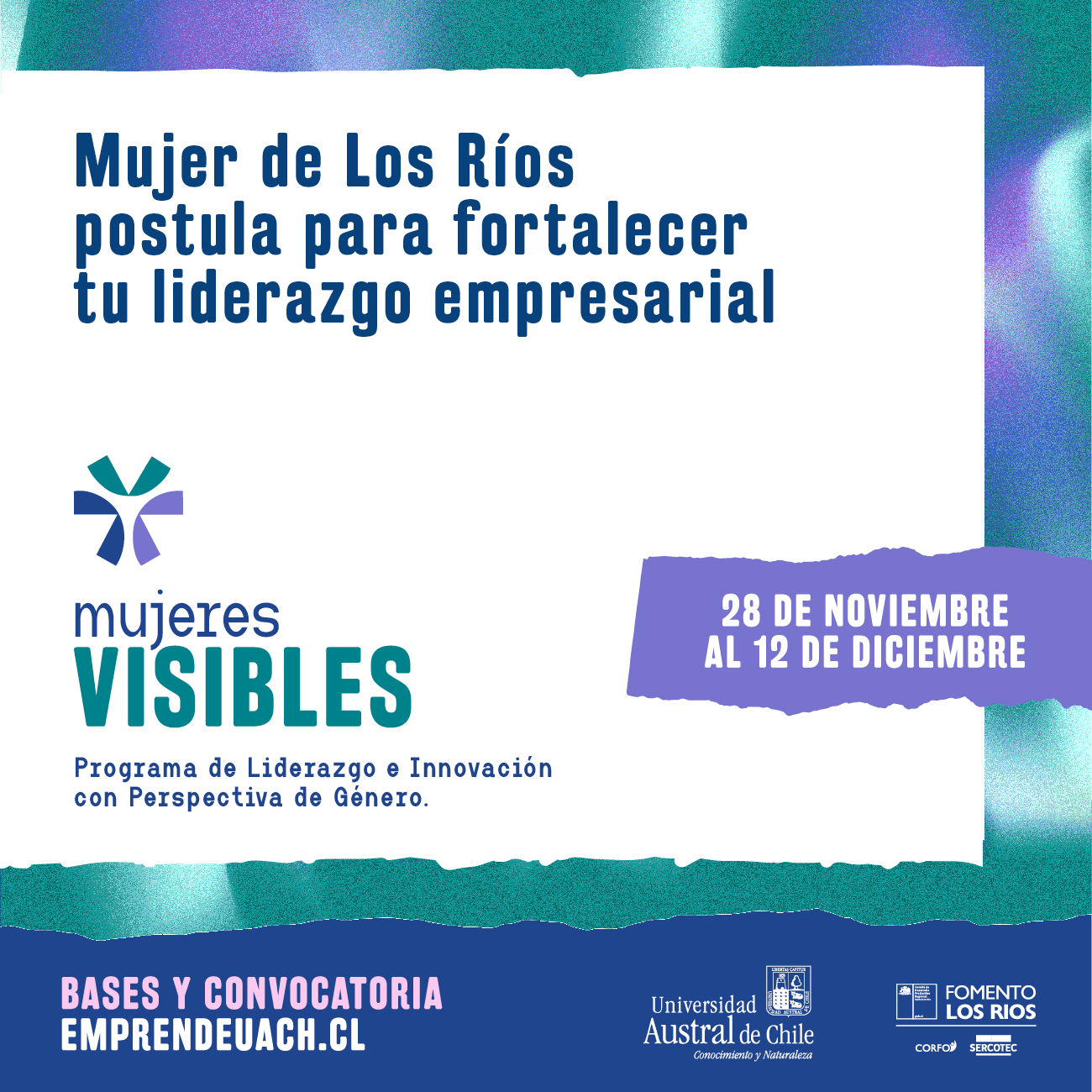 Bajo el título Mujeres Visibles, Programa de Liderazgo e Innovación con Perspectiva de Género, esta iniciativa buscará promover el desarrollo económico y productivo regional a través del fomento de la MIPYMES lideradas por mujeres, mejorando sus capacidades y oportunidades, mediante una serie de actividades a las que podrán optar emprendedoras y empresarias, postulando desde este martes 28 de noviembre y hasta el martes 12 de diciembre (18:00 horas) en http://www.emprendeuach.cl