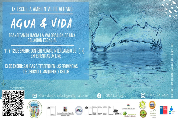 El Comité Regional de Educación Ambiental, CREA Los Lagos, invita a participar en la IX Escuela Ambiental de Verano: Agua y Vida, transitando hacia una relación esencial, la cual tendrá lugar los días 11 y 12 de enero en formato virtual a través de plataforma Zoom de la Universidad Austral de Chile Sede Puerto Montt y el 13 de enero con actividades en terreno en distintos puntos de la región de Los Lagos y Valparaíso.