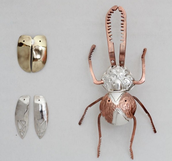 De igual forma, el artista aclaró que a diferencia de trabajos anteriores como fue el caso de “Sísmica” (2013) muestra enteramente realizada en plata y que desarrolló en conjunto con otras dos artistas locales; para “Insectario” prefirió incorporar nuevos materiales como: cobre y bronce dándole mayor contraste a las joyas creadas y diferenciado partes de sus estructuras. “Considero que es un atractivo convertir a los insectos en joyas, especialmente dado las formas que cada uno de ellos posee, sus grandes antenas, las alas, sus estructuras, además que cada uno tiene particularidades únicas que son interesantes de poder rescatar y a través de esto construir piezas.”