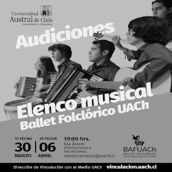 Como ya es tradición, el Ballet Folclórico de la Universidad Austral de Chile abrió una convocatoria para audiciones al elenco musical del ballet, luego de cesar los ingresos el pasado 2020, en esta oportunidad estas audiciones se realizarán de forma virtual, la primera audición se desarrollará este martes 30 de marzo a las 19:00 horas a través de la plataforma zoom y en una segunda oportunidad el martes 06 de abril a la misma hora, de acuerdo a las fechas destinadas por el calendario académico para inscripción de asignaturas en el caso de estudiantes UACh.