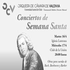 La Orquesta de Cámara de Valdivia presentará dos Conciertos de Semana Santa, con entrada liberada para toda la comunidad valdiviana. En la ocasión, el quinteto de cuerdas del elenco interpretará un repertorio constituido por una selección del arreglo de Caio Facó para las Variaciones Goldberg de Johann Sebastian Bach, la Sonata Claro de luna, de Ludwig van Beethoven, finalizando con la obra del músico estadounidense Samuel Barber, Adagio para cuerdas del año 1938.