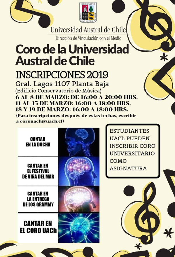 El Coro de la Universidad Austral de Chile (UACh) informa que las inscripciones para el presente año se realizarán a partir del 6 de marzo en el edificio del Conservatorio de Música (General Lagos #1107).