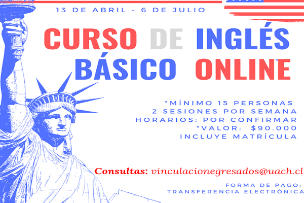 Desde el 13 de abril hasta el 6 de julio se desarrollará este curso que es posible gracias a la asociación entre American Corner de la UACh y la Red de Egresados. Este año en especial, la modalidad del curso será online debido a las medidas de precaución tomadas por la Universidad Austral de Chile debido a la emergencia sanitaria del COVID-19 que afecta a nivel mundial.