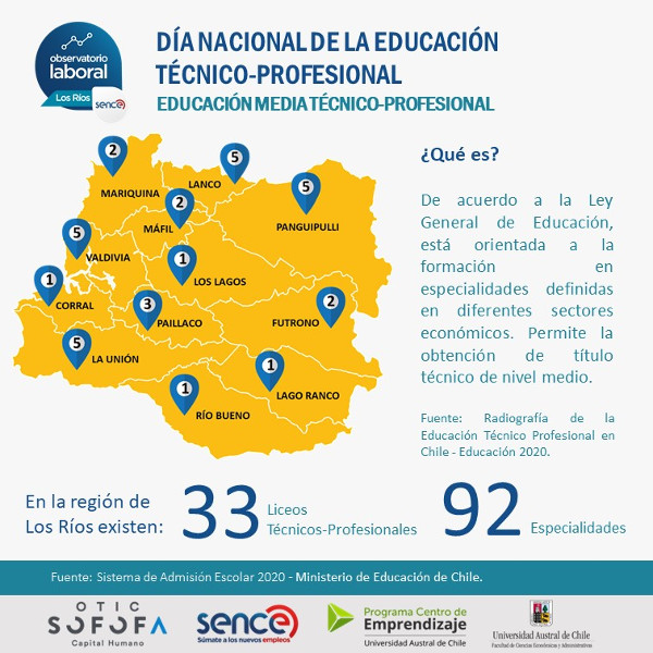 El Observatorio Laboral Regional de Los Ríos de la Universidad Austral de Chile y Sence, ha levantado una serie de datos estadísticos que ponen en realce esa labor, alcanzando un numero de 3.222 técnicos profesionales titulados, ya sea en técnico profesional como titulados en la Educación Media Técnico Profesional. Mientras que los matriculados en la región alcanzan el número de 15.749.