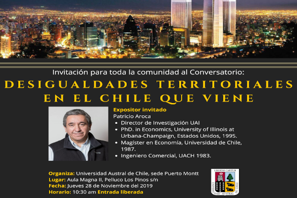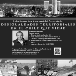 La Sede Puerto Montt de la Universidad Austral de Chile invita al Conversatorio "Desigualdades Territoriales en el Chile que viene", con el expositor invitado PhD. Patricio Aroca, Investigador de la Universidad Adolfo Ibáñéz (UAI).