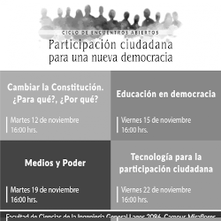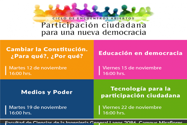 “Participación ciudadana para una nueva democracia” se titula el Ciclo de Encuentros Abiertos que organiza el Instituto de Informática de la Facultad de Ciencias de la Ingeniería UACh, que se llevarán a cabo los días 12, 15, 19 y 22 de noviembre a las 16:00 hrs. en el Campus Miraflores.