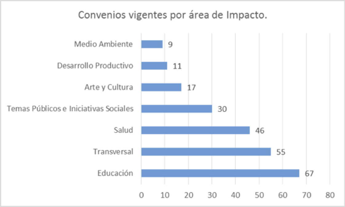 En cuanto a las áreas de impacto, la mayor parte de estos convenios se orientan al área de la Educación (46,5%), seguidos de aquellos que poseen un carácter transversal (38,2%), y, los que tienen impacto en el área de la Salud (32%). También se cuenta con convenios que explicitan el abordaje de Temas Públicos e Iniciativas Sociales (20,8%) y Arte y Cultura (11,8%), mientras en una cantidad menor destaca el desarrollo de las áreas de Desarrollo Productivo (7,6%) y Medio Ambiente (6,3%).