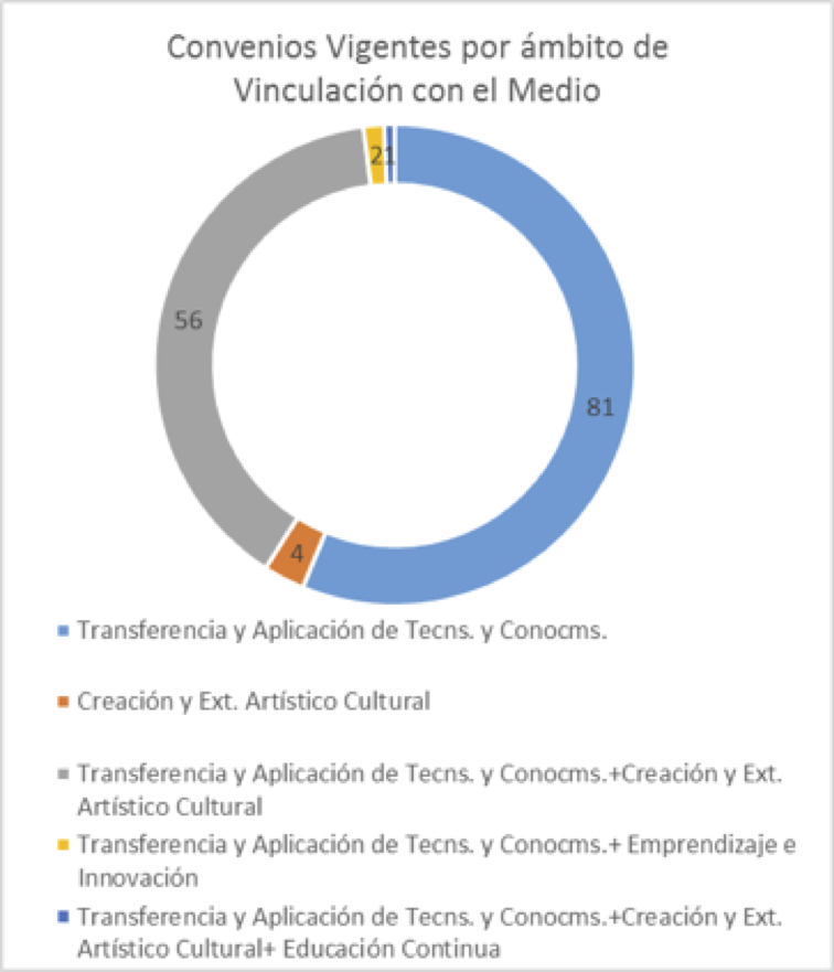 Los convenios constituyen mecanismos formales que la Universidad ha implementado para fortalecer la generación de nexos con diversos actores del medio externo, a través de los cuales se establecen relaciones de colaboración mutua en áreas de impacto clave. Entre los años 2009 y 2014, se han establecido al menos 144 convenios formales, incluyendo alianzas de alcance local (22,9%), comunal (muchas veces abarcando más de dos comunas) (43,8%), regional (20,1%), nacional (14,6%), e internacional (0,6%). Para el 2014, la mayor parte de estos convenios se orientan al ámbito de la Transferencia y Aplicación de Tecnologías y Conocimientos, seguidos de una importante cantidad que combina este ámbito con el de la Creación y Extensión Artístico Cultural.