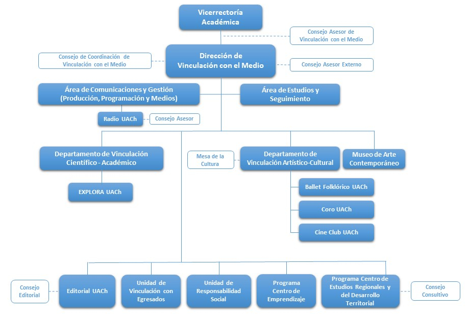 La orgánica que comprende esta Dirección fue sancionada el 2007 y se organizó en departamentos y unidades especializadas. Sin embargo, ésta se ha visto transformada en el tiempo, producto de la creación de nuevas unidades, programas y áreas, atendiendo al aumento y diversificación de los requerimientos propios del ámbito de Vinculación con el Medio. Actualmente, forman parte de la Dirección, el Departamento de Vinculación Científico Académico del que depende el Programa PAR Explora UACh Los Ríos; el Departamento de Vinculación Artístico Cultural del que dependen el Cine Club y los elencos Ballet Folklórico UACh (BAFUACh) y Coro Universitario; el Museo de Arte Contemporáneo; el área de Estudios y Seguimiento; el área de Comunicaciones y Gestión de la que depende la Radio UACh y recientemente el desarrollo de la plataforma digital de transmisión audiovisual a través de la señal de cable 52 (SD) y 843 (HD) de Telefónica del Sur; las Unidades de Vinculación con Egresados y Responsabilidad Social; la Editorial Universidad Austral de Chile;  el Programa Centro de Estudios Regionales y del Desarrollo Territorial; y el Programa Centro de Emprendizaje.